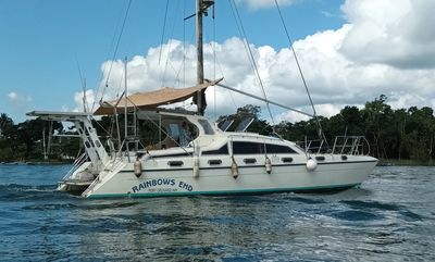 S/V Rainbow’s End has been given many special upgrades such as: a custom fiberglass dodger, cockpit enclosure (custom hard top with Isinglass inserts) with rainwater catchment drains above the water tank fills, and a full boat storage cover only 10mths old. The deck has been upgraded, (balsa core removed and upgraded with Nydacore), there is absolutely no soft spots on the deck, the deck by the windlass is solid fiberglass with epoxy.