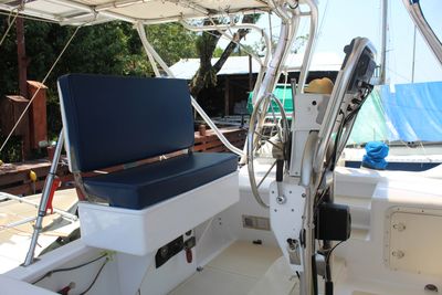 Each of the hulls have three watertight compartments and each compartment has its own access hatch. There is a collision bulkhead in each bow. The hulls are used for tankage, vessel systems, and ample storage. A carbon fiber daggerboard is fitted into each hull within a watertight trunk. Netting between the hulls and between the hulls and cabin is vinyl coated polyester. There is a solid platform aft of the cockpit which supports a dinghy and its rack while underway and provides a pleasant “back porch” at anchor. Canvas privacy curtains make this a perfect location for showers.